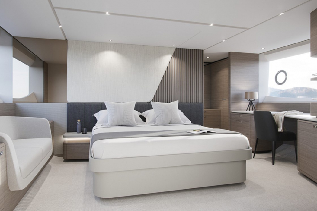 Finished to high standards throughout, the all-new Y72s design features are comparable to those of larger Y Class yachts. Her spacious saloon has a sociable layout with a bar area and open plan galley, complemented by a multi-zone Naim audio system. Eight guests are accommodated across four well-appointed en suite cabins with the full beam master stateroom accessible via a private stairway from the saloon. There is a further aft cabin with two berths for crew or occasional guests.