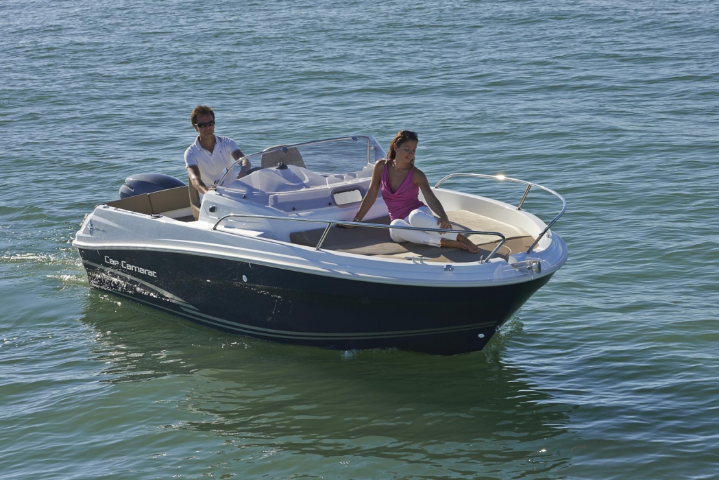 The Cap Camarat 5.5 WA features contemporary fluid lines. With her tapered V-shaped Jeanneau hull, she demonstrates excellent handling and seakeeping for family use and quick planing for waterskiing. With her sliding central seating, the aft cockpit is spacious and inviting, even when the engine is up. Simply turn the bolster seats around when guests gather around the table. The bright and airy cabin features a chemical WC, a double birth and storage compartments. The forward deck, level and recessed, is ideal for relaxing on the sundeck.