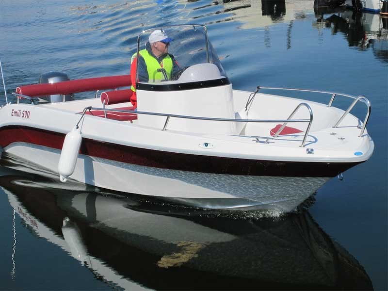 Standard Equipment: Steering console, hatch in floor, stainless steel railings, three lockers, 4 cleats, trailer hook, navigation lights, steering wheel and steering cable, two chairs or one sofa, 95 ltr. fuel tank, fuel cap, boarding ladder, bilge pump, anchor boxes at bow and aft, deck drain, fender profile