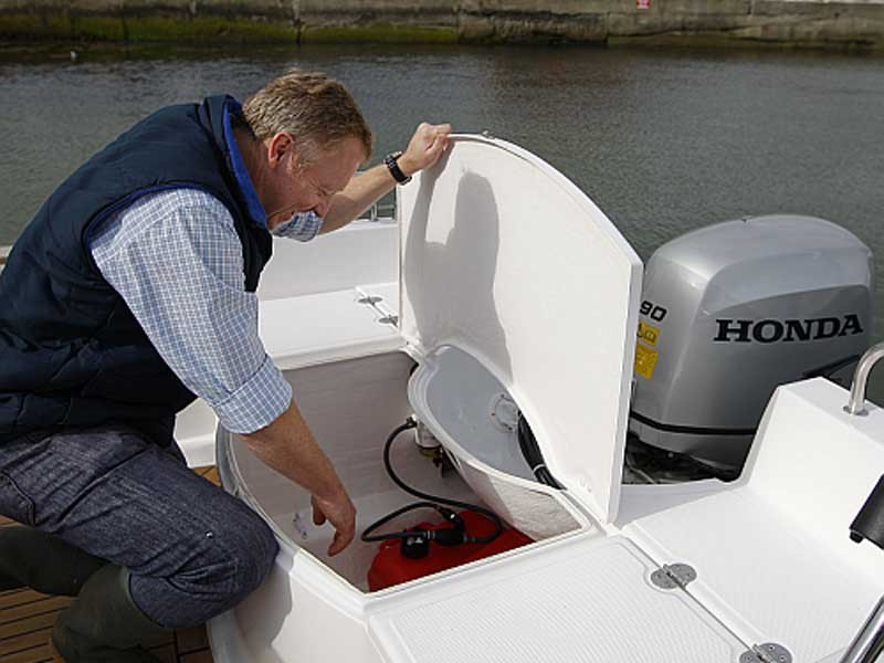 Standard Equipment: Steering console, hatch in floor, stainless steel railings, three lockers, 4 cleats, trailer hook, navigation lights, steering wheel and steering cable, two chairs or one sofa, 95 ltr. fuel tank, fuel cap, boarding ladder, anchor boxes at bow and aft, deck drain, fender profile