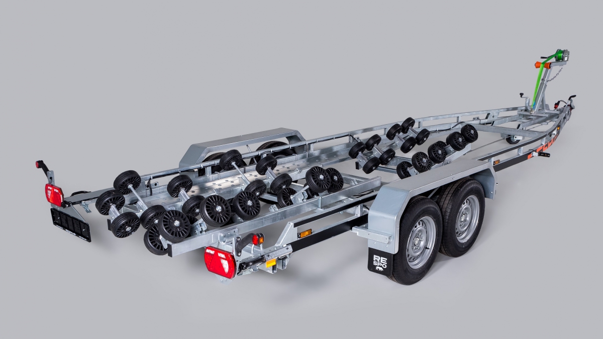 Robust yet light frame and instead of keel rollers we have equipped this unit with a self adjusting multi roller system. And by the term multi roller system we do mean 36 rollers connected through a system of beams and brackets that automatically adjust themselves to the hull of your boat. This solution has been long sought for by owners of boats that have a non standard hull with steps in the keel etc. The trailer will fit a boat with a regular hull as well though.